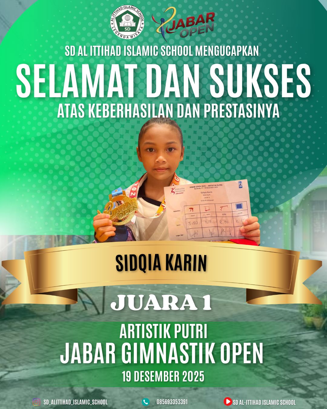 Selamat kepada ananda Sidqia Karin atas keberhasilan dan prestasinya meraih Juara 1 Artistik Putri pada gelaran Jabar Gimnastik Open yang diselenggarakan pada 19 Desember 2025, Kami Bangga !!!